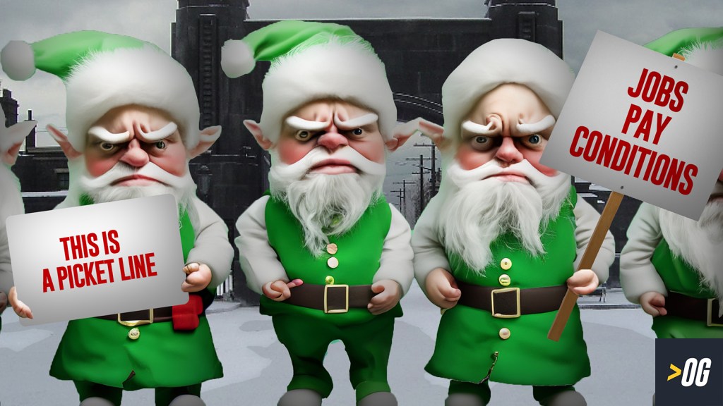 Last-minute industrial action was unanimously voted through by ELF (Elvish Labourers Federation), a union comprising 90% of the Christmas workforce. Resentment has been simmering for decades, as rising demands for presents piled pressure on workers.